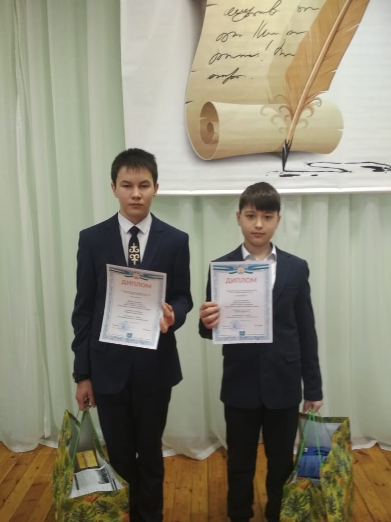 В марте прошел Конкурс буктрейлеров «Читающие родители-читающие дети», посвященный юбилею народного поэта Башкортостана Рами Гарипова, организованная Уфимским БГПУ им. М. Акмуллы .На конкурсе из нашей школы участвовали семьи Кулушевых и Багаевых. Было 8 номинаций. Кулушев Мурат учащийся 6 класс в номинации "Эхо истории" стал победителем .(Буктрейлер по книге Анвера Бикчентаева "Орел умирает на лету"). В номинации " Новое дыхание в литературе " Багаев Нуриман , учащийся 8 класса также стал победителем.(Буктрейлер по книге Айгиза Баймухаметова "Не оставляй, мама!"). 11 марта ребята с руководителем работ, заведующей школьной библиотеки Хамитовой Л.Р. ездили на награждение в г. Ишимбай в гимназию №2 им. Ахметзаки Валиди. . Ребятам вручили дипломы победителя МО и н РБ и ценные подарки.
