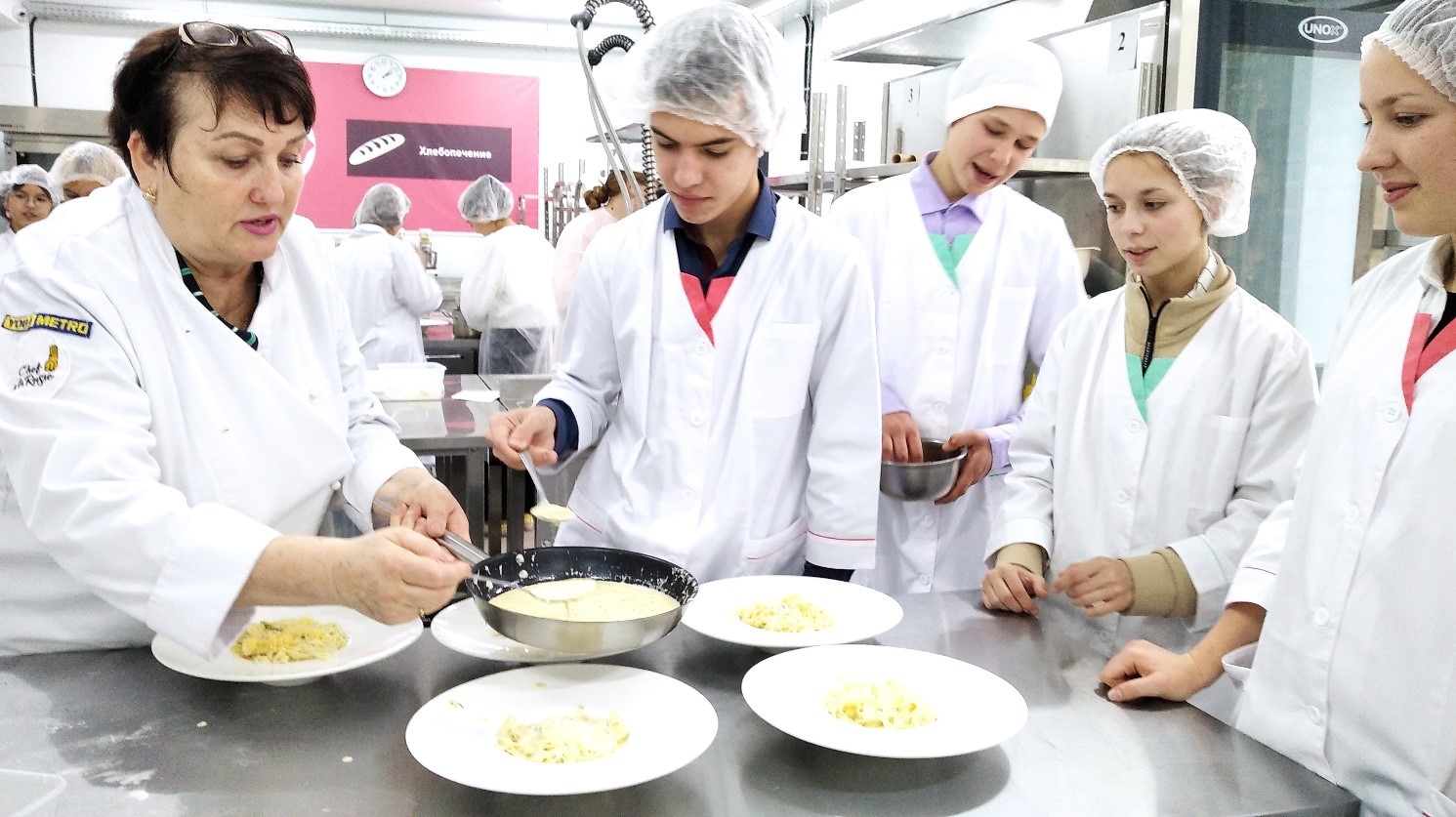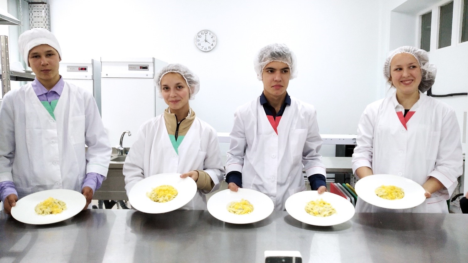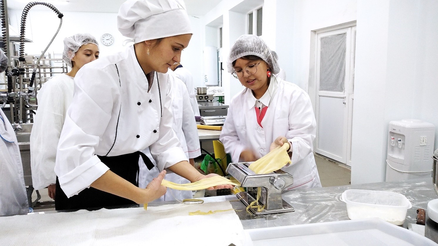 На демонстрационной площадке «Поварское дело» под наставничеством преподавателя Светланы Дмитриевой познакомились с организацией рабочих мест на кухне, гигиеническими требованиями к внешнему виду повара. Школьники активно участвовали в приготовлении итальянской пасты: месили и закатывали тесто, с помощью специального оборудования для раскатки и нарезки пасты готовили саму пасту и к ней специальный сырно-сливочный соус.