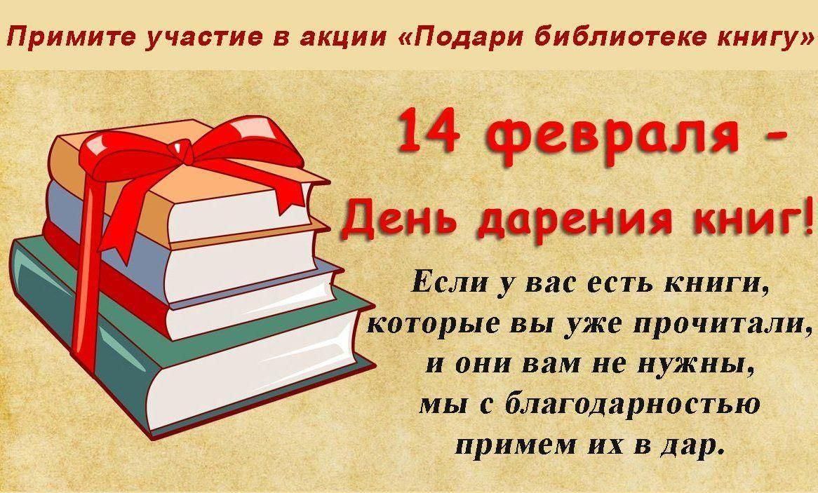 С 14 февраля 2012 года отмечается один из самых молодых праздников — Международный день дарения книги. Главная идея Международного дня книгодарения — показать, что по-прежнему "Книга — лучший подарок" и не теряет своей ценности даже в век технологий. В этот день также собирают книги для нуждающихся библиотек, которым так не хватает новых книг для пополнения и обновления их фондов.